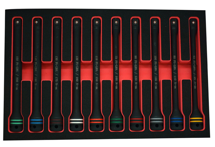 トルクスティックバーのカラーコードは、異なるトルク制限を表しています。そのため、整備士は車種ごとに適切なトルクを簡単に見つけることができます。トルクが一定のポイントに達すると、バーが曲がり、もう一方の端が動かなくなります。これは金属の厚さに関係しており、金属が厚いほど、より多くのトルクを処理できます。