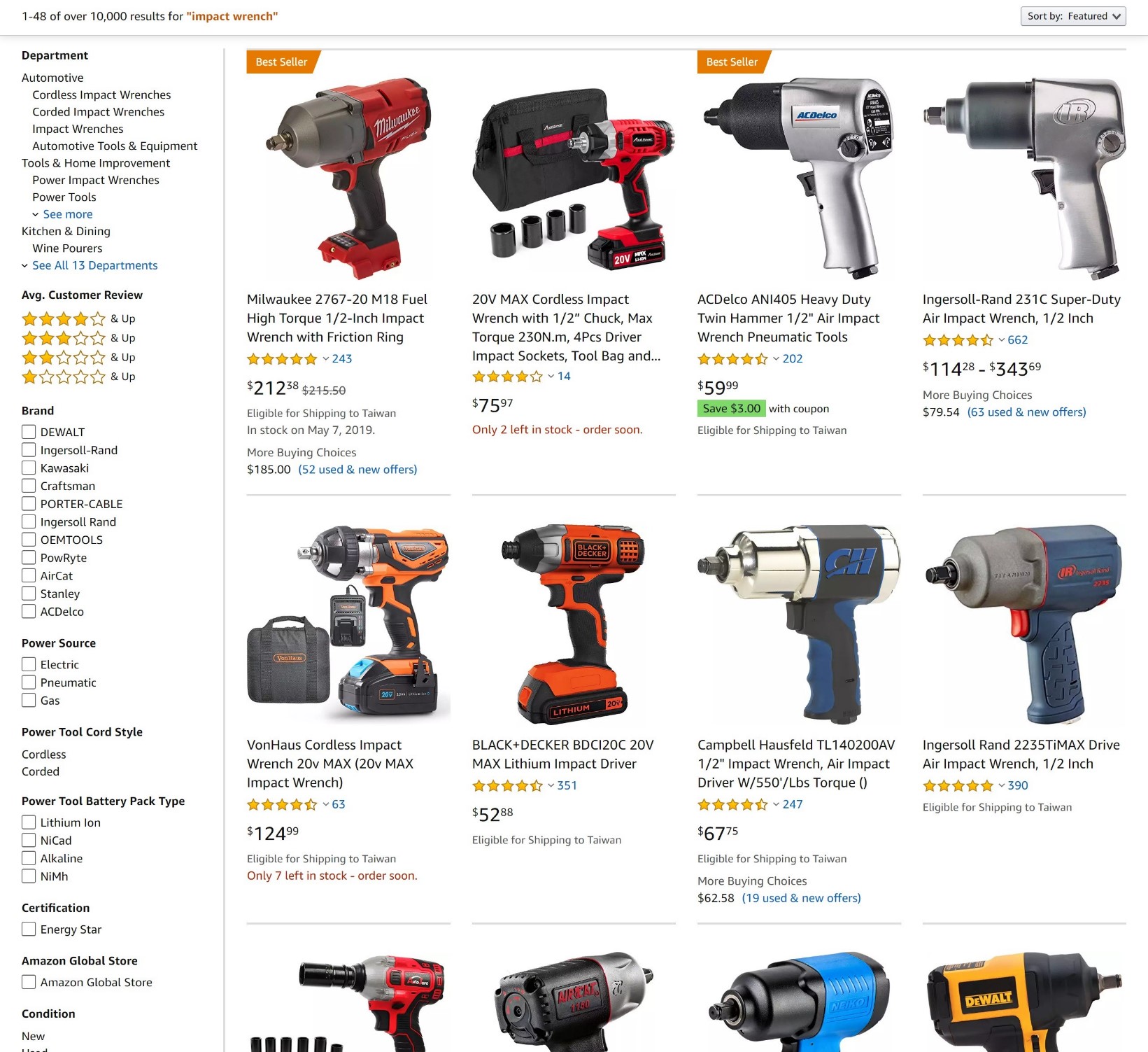 その結果、多くの工具ブランドがエアインパクトレンチや電動インパクトレンチを次々と発表しています。以下は、Amazonで「インパクトレンチ」を検索した際の最初のページの結果です。これには空気式(エア)、電動、コードレスのインパクトレンチが含まれます。