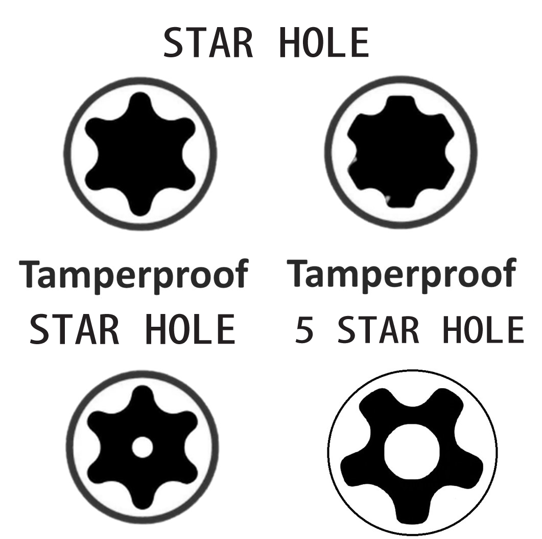 - 5つのローブを持つ星型ビットは、スターねじに高いトルクでフィットし、カムアウトを防ぎます。自転車、自動車、家電製品、芝刈り機、機械など、スターねじやボルトを使用するあらゆる作業に適しています。